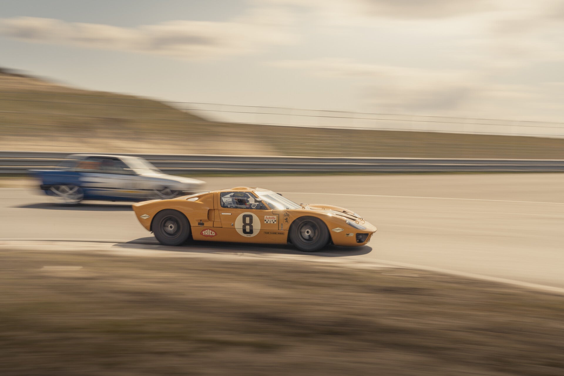 Deze fantastiche Ford GT40 is vastgelegd in de Hans Ernst bocht van het Citcuit Zandvoort terwijl hij een BMW e30 inhaald.